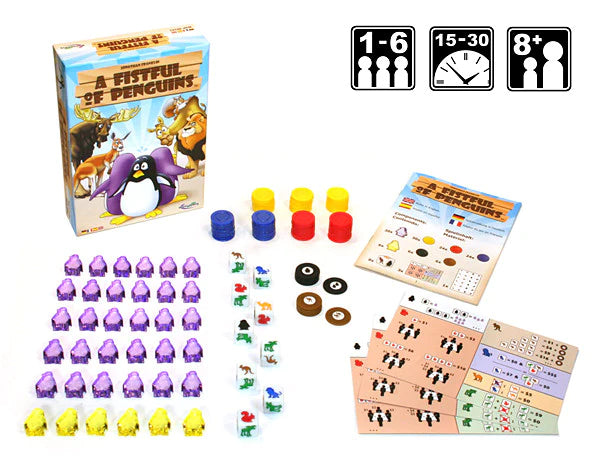 Here come the animals! Add lions, camels, and kangaroos to your zoo in this simple dice game the whole family can enjoy. Lions are a big draw, but they scare the camels. Those pesky squirrels will pilfer your peanuts, but a moose won't go anywhere without a squirrel. And the more kangaroos the better. Use your penguins wisely, and you can have the best zoo in the country!