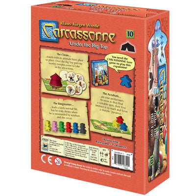 An exciting new world awaits in Under the Big Top, the tenth expansion for the award-winning tile-laying game Carcassonne. Capturing the thrill of the circus, this expansion incorporates twenty new Land tiles and two new follower types. Use them to attract people from all over the countryside to view your menagerie of animals or to witness feats of death-defying skill. Just like the daring risks that circus performers take, Under the Big Top gives players plenty of opportunities to score big points—if they can draw in the crowds!