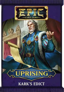 Epic Card Game: Uprising is an expansion for the Epic Card Game that's packaged in four non-random booster packs (Flames of Scarros, Kark's Edict, Velden's Wrath, and Will of Zannos), with each booster pack containing twelve new game cards and a double-sided token.