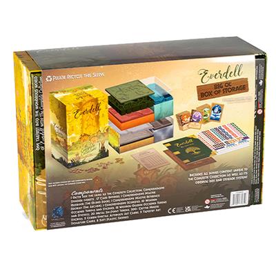 The Big Ol' Box of Storage safely stores Everdell Collectors Edition, Sprirecrest, Bellfaire, Pearlbrook, Newleaf, Mistwood, the Deluxe Storage Vessels, the Wooden Ever Tree, and the Click Clacks Upgrade Pack.