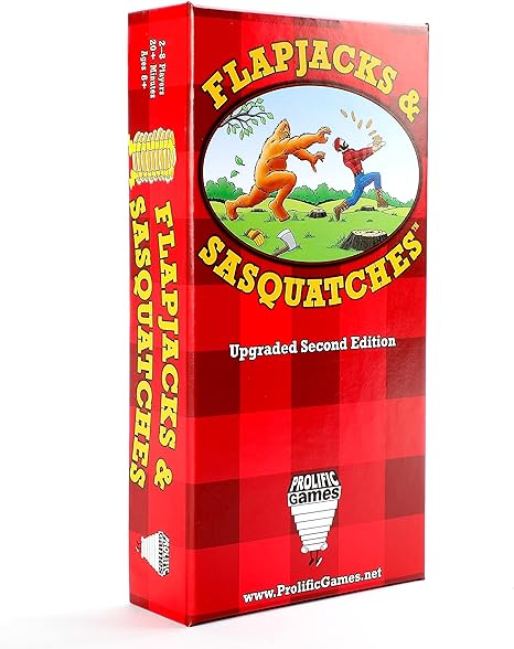Flapjacks and Sasquatches is an easy, "take that" style card game in which you want to chop down the tree card in front of you. The card has both a "chop" value and a point value; using Axe cards, you roll dice to try to meet or exceed the "chop" value. When you do, you collect the tree (and the points). Flapjack cards can add to your roll, while blister cards can take away.