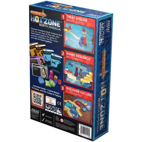 Disease threatens North America and only you can stop it! In Pandemic: Hot Zone – North America, players work together against the game to discover cures for three deadly diseases that threaten the continent. Travel to different North American cities to treat local populations, prevent outbreaks, and share research with your team. Can you discover the cures before it's too late?