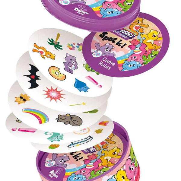 Unlock the magic in this fun and competitive pattern recognition game with a pop culture twist for a new way to enjoy your 80s favorites! In Care Bears Spot It!, there is only one matching character or item between any two cards. Be the first one to spot pairs of four-leaf clovers, donuts, and other symbols from the colorful Kingdom of Caring to win!