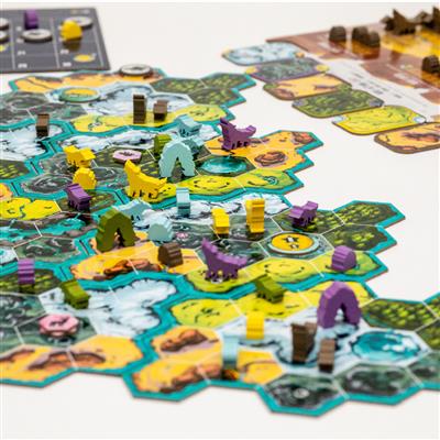A clever action-selection mechanism drives your choices. Each action requires you to flip terrain tiles matching the terrain where you wish to take your action. These double-sided tiles mean the actions you take this round will set up which terrain types you can act on in the next round. As you take actions to expand your pack’s control of each region, you will also upgrade your pack’s attributes, allowing you to take more aggressive actions as the game goes on.