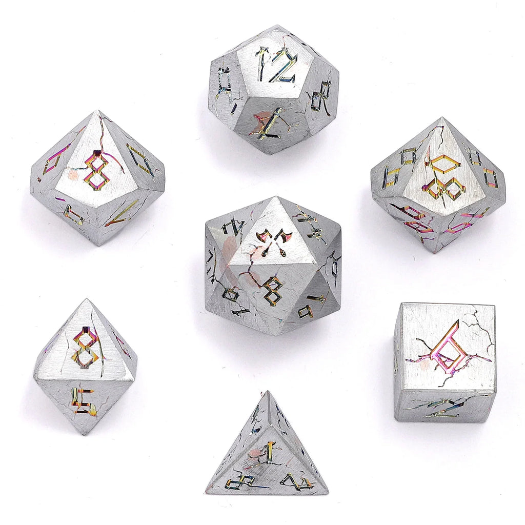 Set of 7 polyhedral dice in matte silver and rainbow.