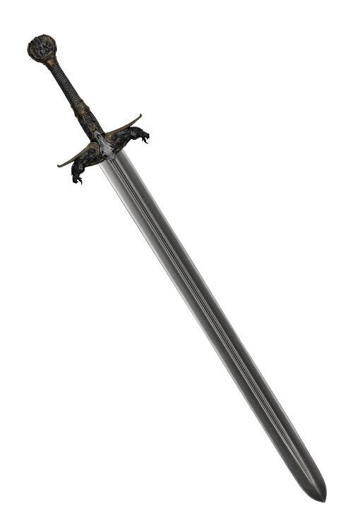 Calimacil has created an original weapon inspired by the Four Horsemen of the Apocalypse. The handle is intricately detailed, featuring a pommel with chainmail like that of a knight, and a guard with two demonic horse heads. The sword is crafted with a Fine Double Fuller Blade II, striking the perfect balance between sharpness and safety. The exquisite royal details of this sword make it a perfect fit for knights, noblemen, and lords, whether they be from our realm or from distant lands. However, its devilish design may also appeal to those with ill intentions who wish to bring about the apocalypse. There are always new details to discover, making this sword an exceptional piece of art.