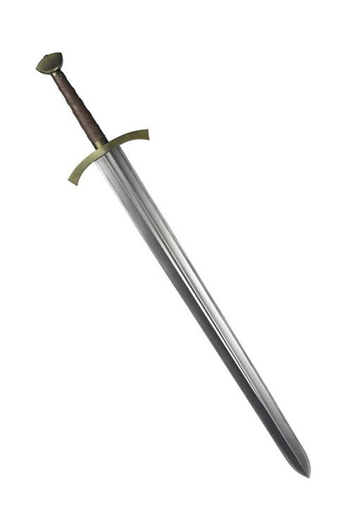 Introducing the Rob Sharp sword from Calimacil, featuring an incredibly realistic blade edge that is entirely safe and durable thanks to Calimacil foam. The steel-colored blade boasts a silver edge and a tarnished gold guard, while the handle is wrapped in brown foam designed to resemble leather for both a more secure grip and a historical appearance. This LARP sword is perfect for those seeking to impress their peers or showcase their regal qualities, as it exudes a unique and striking style. Additionally, this versatile blade can be worn on the belt of a nobleman or used to intimidate petty thieves, making it a family favorite!