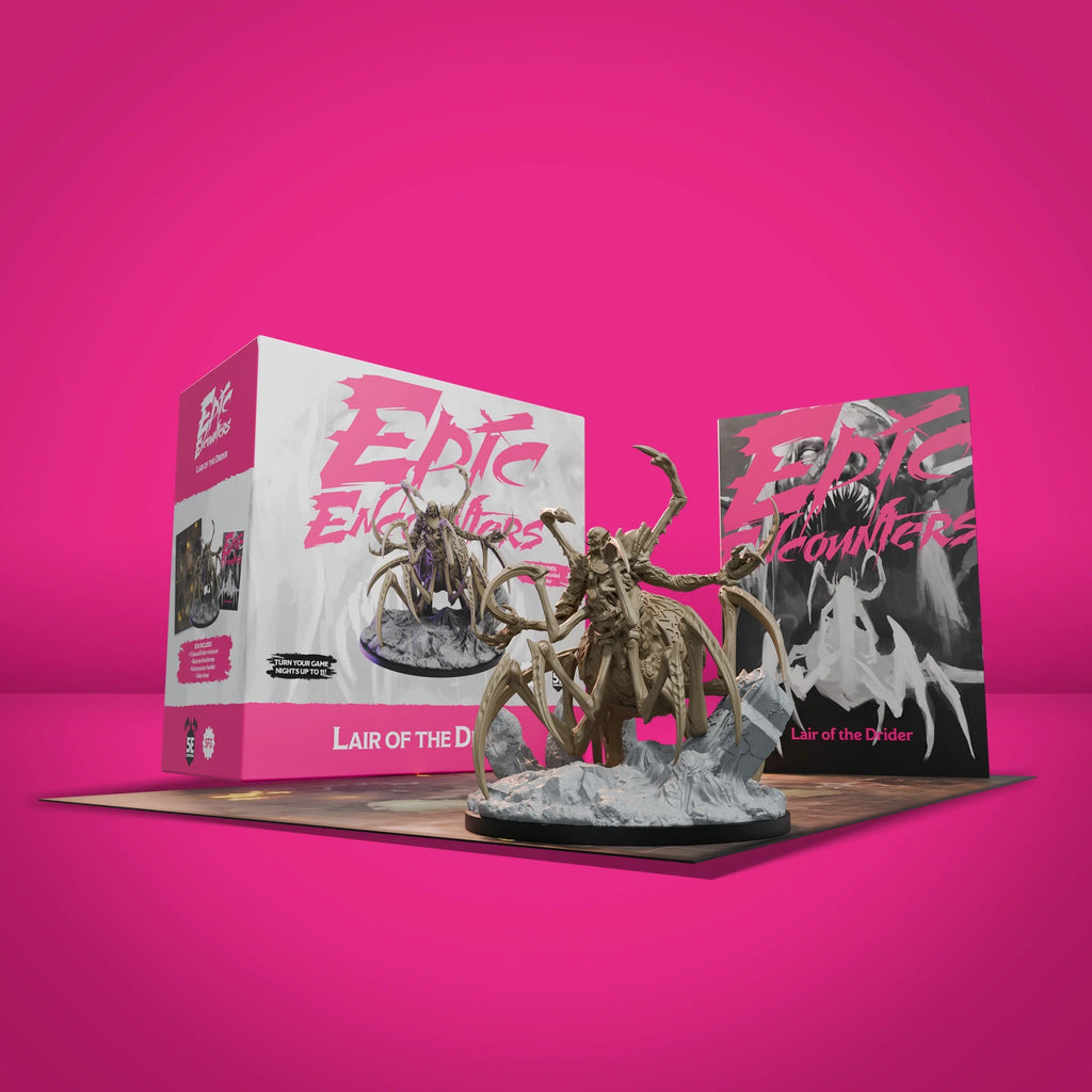 Twisted and evil, the monstrous Drider lurks in a place between worlds, waiting to feast on the unwary. Dare you enter the creature's abode? Containing the enormous, beautifully detailed Drider miniature (on a 100mm base!), this is the ultimate aid to running a thrilling boss encounter in your fantasy roleplaying games. Complete with a double-sided battlemap, an encounter booklet detailing exactly how to craft the most exciting encounter possible, and all the tokens you need, this box is everything required to make your boss battle epic!