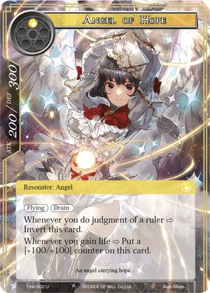 Angel of Hope [Flying] [Drain] Whenever you do judgment of a ruler -> Invert this card. Whenever you gain life -> Put a [+100/+100] counter on this card. Angel of Despair [Flying] When this card inverts -> Destroy target resonator if there is a [+100/+100] counter on this card.