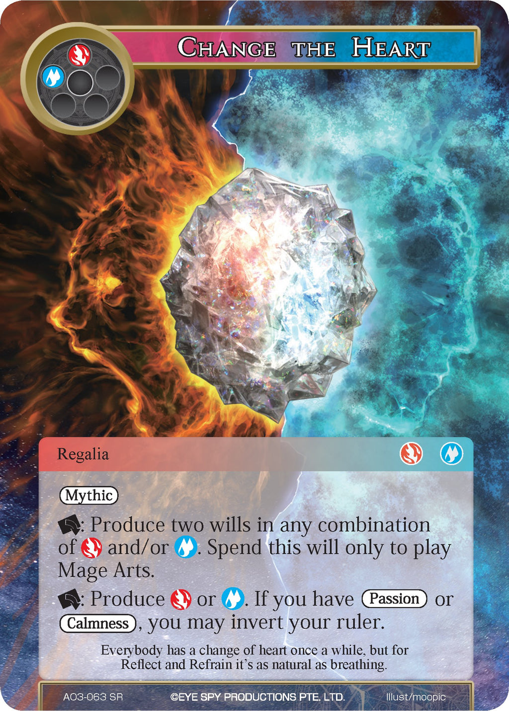 [Mythic] [Rest]: Produce two wills in any combination of R and/or U. Spend this will only to play Mage Arts. [Rest]: Produce R or U. If you have [Passion] or [Calmness], you may invert your ruler.