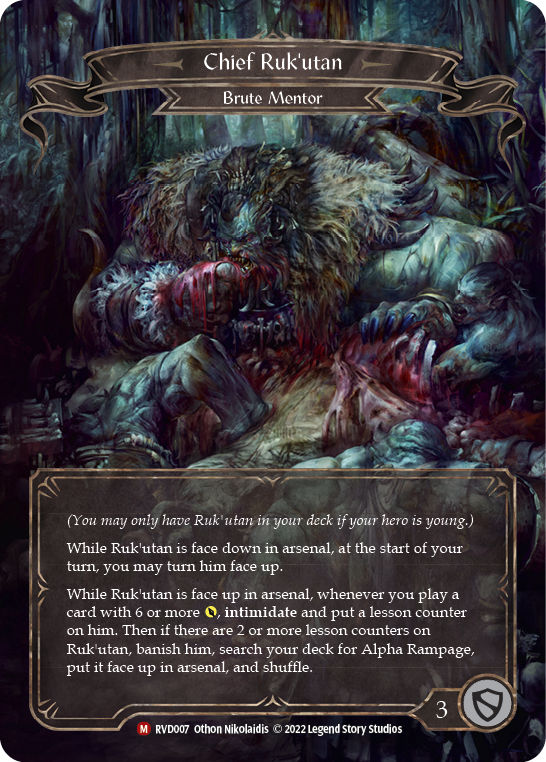 While Ruk'utan is face up in arsenal, whenever you play a card with 6 or more {p}, intimidate and put a lesson counter on him. Then if there are 2 or more lesson counters on Ruk'utan, banish him, search your deck for Alpha Rampage, put it face up in arsenal, and shuffle.