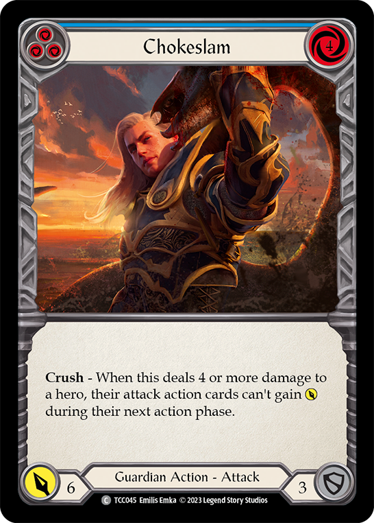 Crush - When this deals 4 or more damage to a hero, their attack action cards can't gain {p} during their next action phase.