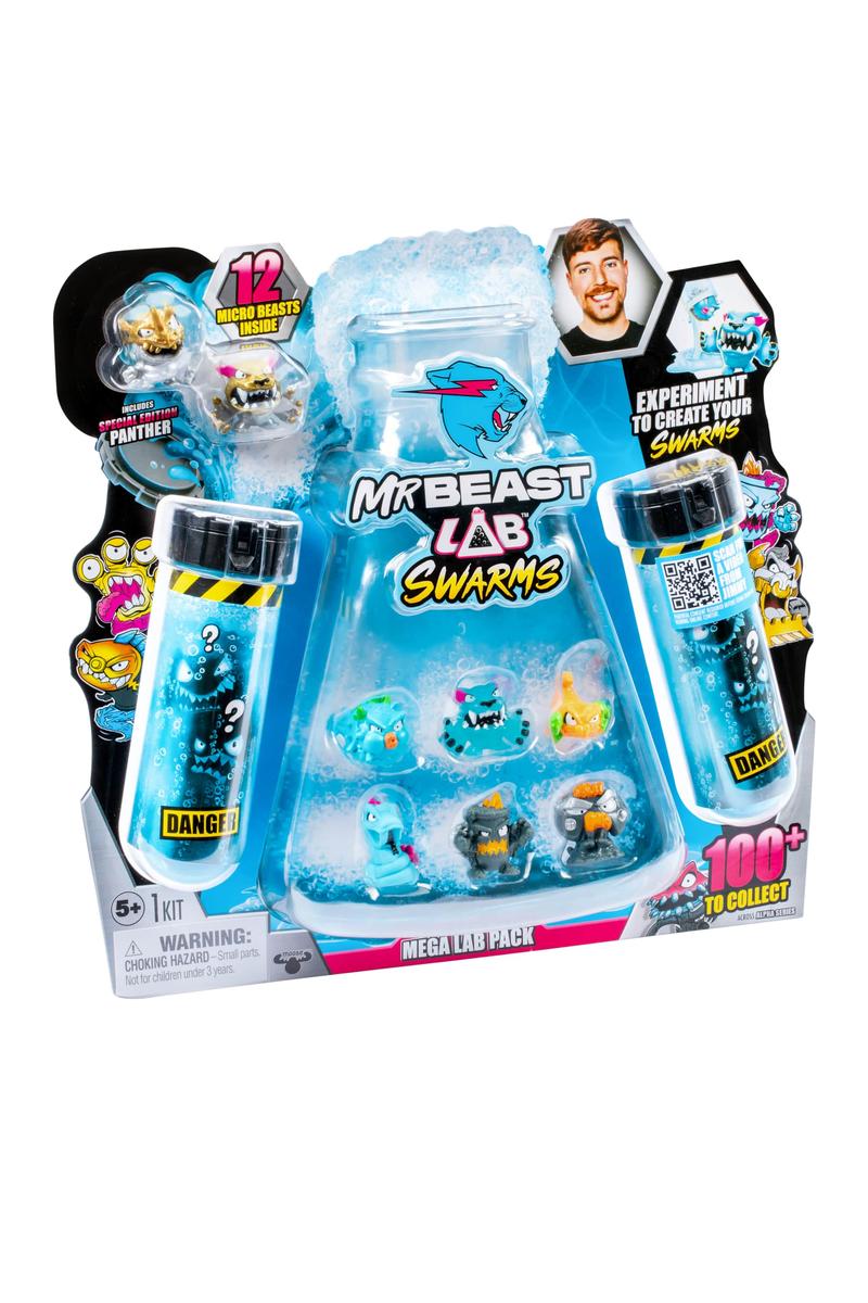 Prepare for the ultimate experiment co-created with YouTube sensation MrBeast! The MrBeast Lab Swarms Mega Lab 12 Pack invites you to mix, shake, and create your own chaos. This epic pack includes 12 Swarm microbeasts, with a guaranteed Special Edition Hard Head Panther, unleashing a world of discovery and collectible excitement.
